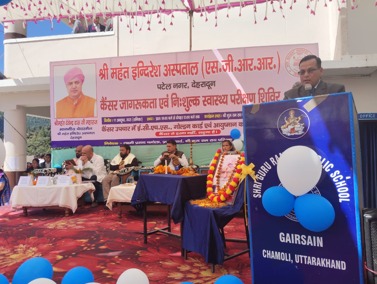देहरादून: श्री महंत इन्दिरेश अस्पताल, देहरादून के सौजन्य से श्री गुरु राम राय पब्लिक स्कूल, गैरसैंण में शनिवार, 11 अक्टूबर 2025 को कैंसर जागरूकता एवं निःशुल्क स्वास्थ्य परीक्षण शिविर का सफल आयोजन किया गया। इस अवसर पर 3002 से अधिक मरीजों ने शिविर का लाभ उठाया। शिविर में अस्पताल के विशेषज्ञ चिकित्सकों ने स्वास्थ्य परामर्श दिया तथा रोगियों को निःशुल्क दवाइयाँ वितरित की गईं।