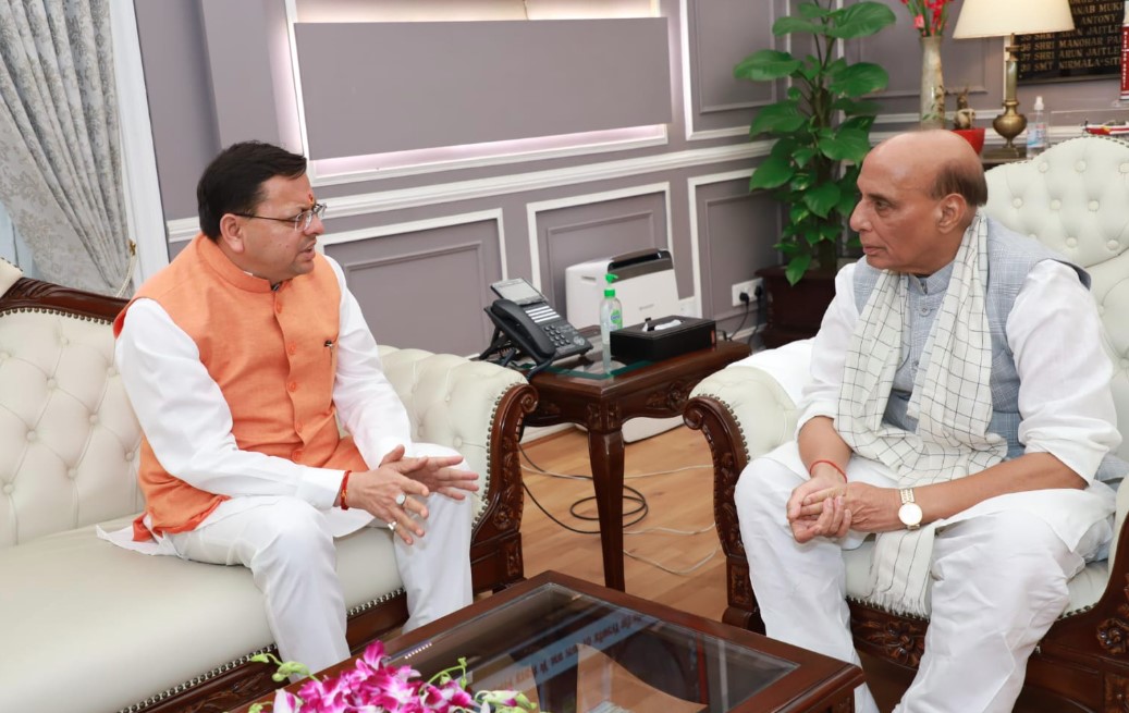 देहरादून/नई दिल्ली: मुख्यमंत्री पुष्कर सिंह धामी ने मंगलवार को नई दिल्ली में केंद्रीय रक्षा मंत्री राजनाथ सिंह से भेंट कर राज्य से जुड़े महत्वपूर्ण विषयों पर चर्चा की। मुख्यमंत्री ने केन्द्रीय रक्षा मंत्री से रानीखेत और लैंसडाउन छावनी क्षेत्र को नगर पालिकाओं के साथ विलय करने का अनुरोध किया। जिससे इन क्षेत्रों में पर्यटन एवं जनसुविधाओं के समग्र विकास में सहयोग मिलेगा।