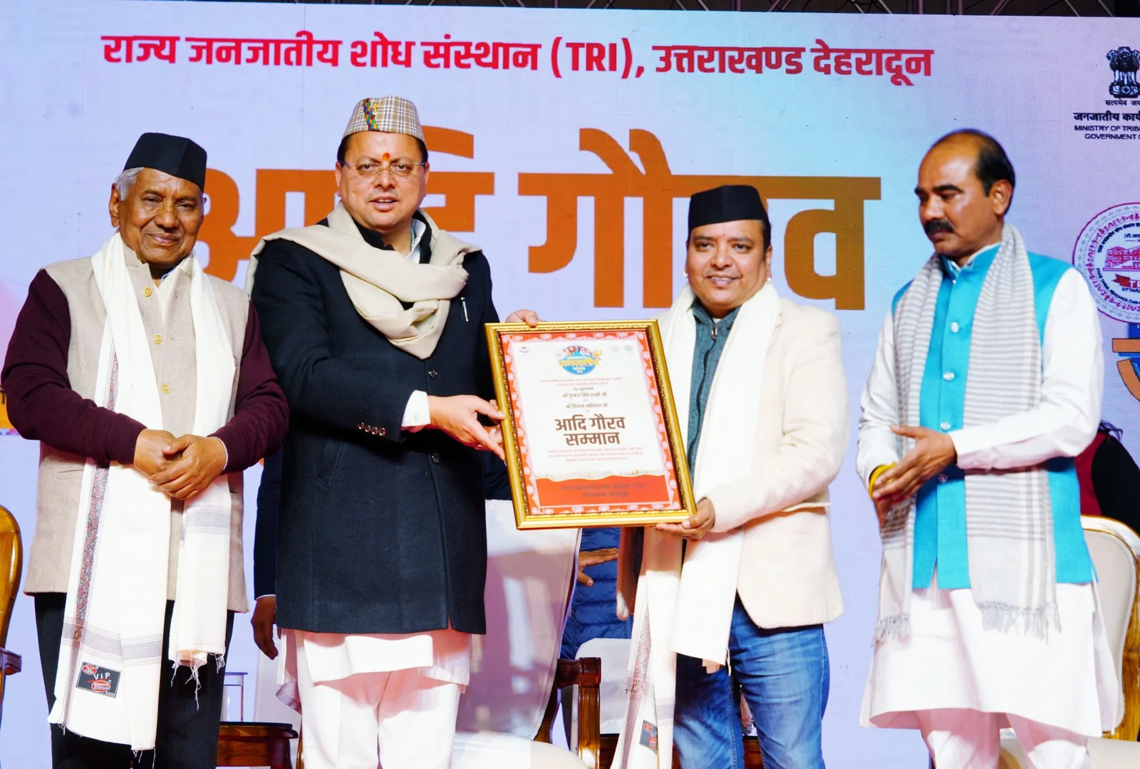 देहरादून: मुख्यमंत्री  पुष्कर सिंह धामी ने शनिवार को परेड ग्राउंड देहरादून में राज्य जनजातीय शोध संस्थान द्वारा आयोजित उत्तराखंड जनजातीय महोत्सव – 2025 कार्यक्रम में प्रतिभाग किया। इस अवसर पर मुख्यमंत्री ने उत्तराखंड आदि गौरव सम्मान पुरस्कार – 2025 से लोक गायक श्री नरेंद्र सिंह नेगी एवं किशन महीपाल को सम्मानित किया।