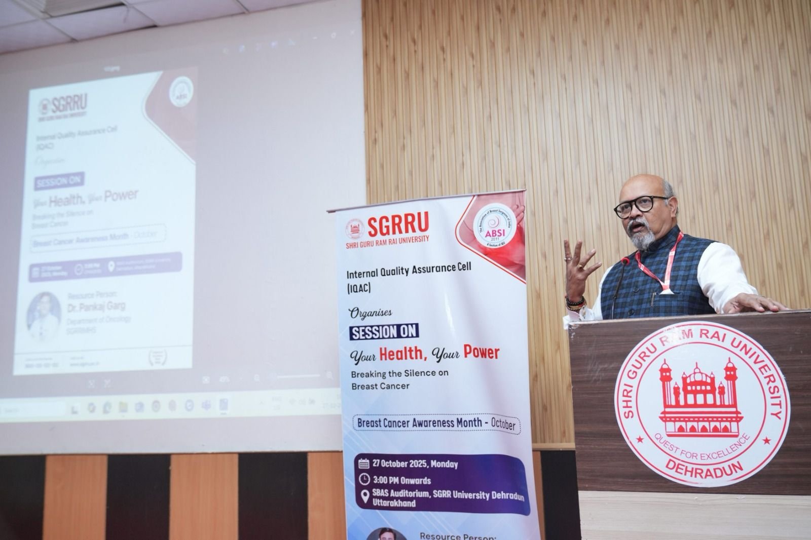 देहरादून: स्तन कैंसर जागरूकता माह के अंतर्गत, श्री गुरु राम राय विश्वविद्यालय के आंतरिक गुणवत्ता आश्वासन प्रकोष्ठ (IQAC) द्वारा पोस्टर मेकिंग प्रतियोगिता एवं अतिथि व्याख्यान का आयोजन किया गया। इस कार्यक्रम का उद्देश्य छात्रों और अध्यापकों में स्तन कैंसर के प्रति जागरूकता बढ़ाना और समय पर जाँच एवं आत्म-परीक्षण के महत्व को समझाना था।