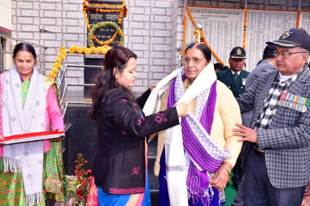 कार्यक्रम के दौरान शहीद सैनिकों के परिजनों—पानूनी देवी (पत्नी स्व. खड़क सिंह), नंदी देवी (पत्नी स्व. नारायण सिंह), पदमा देवी (पत्नी स्व. मोहन राम) एवं कलावती देवी (पत्नी स्व. भैरव दत्त)—को शॉल ओढ़ाकर सम्मानित किया गया तथा राष्ट्र के प्रति उनके अमूल्य योगदान को नमन किया गया।
