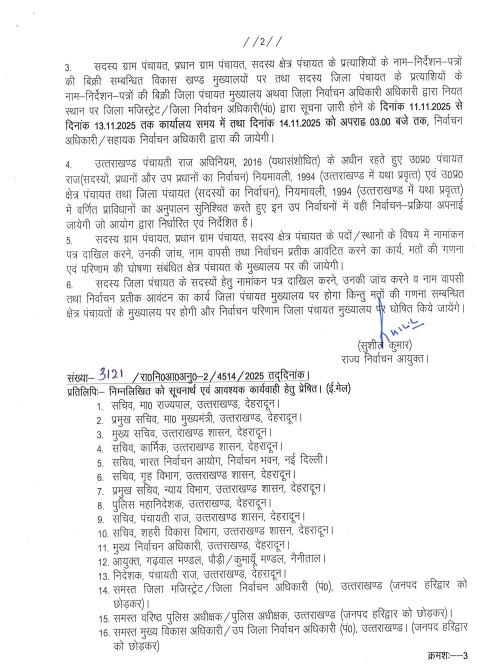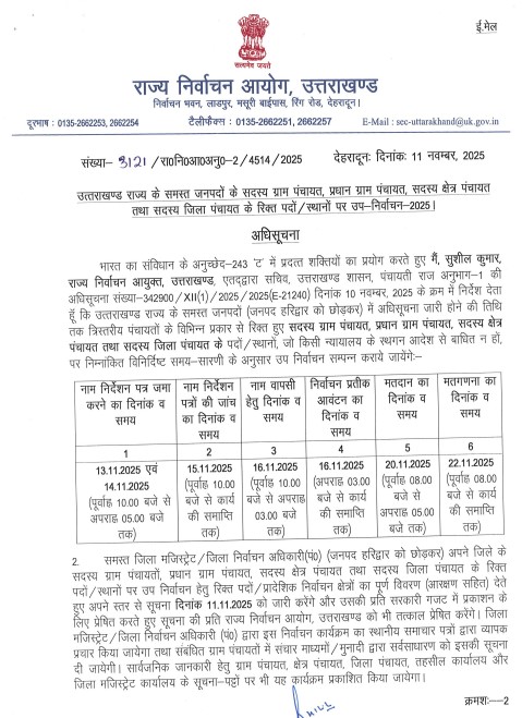 देहरादून: उत्तराखंड में त्रिस्तरीय पंचायतों के खाली पड़े हजारों पदों को भरने के लिए राज्य निर्वाचन आयोग ने उपचुनाव की अधिसूचना जारी कर दी है। हरिद्वार को छोड़कर राज्य के 12 जिलों में ये चुनाव कराए जाएंगे। आयोग ने नामांकन प्रक्रिया 13 और 14 नवंबर को रखी है, जबकि मतदान 20 नवंबर को होगा। मतगणना की प्रक्रिया 22 नवंबर को पूरी की जाएगी। अगस्त-सितंबर में हुए पंचायत चुनावों के बाद राज्य में ग्राम पंचायत सदस्य, प्रधान, क्षेत्र पंचायत सदस्य और जिला पंचायत सदस्य के कई पद खाली रह गए थे। अब आयोग ने इन रिक्त पदों को भरने की दिशा में प्रक्रिया शुरू कर दी है। अधिसूचना जारी होने के साथ ही आदर्श आचरण संहिता भी लागू हो गई है, जो मतगणना पूरी होने तक प्रभावी रहेगी।