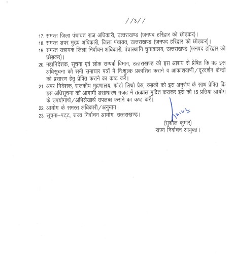 राज्य के 12 जिलों में सदस्य ग्राम पंचायत, प्रधान ग्राम पंचायत, सदस्य क्षेत्र पंचायत और जिला पंचायत के रिक्त पदों पर चुनाव होंगे। इनमें अल्मोड़ा (6241 सदस्य पद), पौड़ी (6068 पद), टिहरी (4170 पद), पिथौरागढ़ (2927 पद), चमोली (2812 पद), उत्तरकाशी (1961 पद), बागेश्वर (1610 पद), रुद्रप्रयाग (1436 पद), नैनीताल (2268 पद), चंपावत (1702 पद), ऊधमसिंह नगर (938 पद) और देहरादून (801 पद) शामिल हैं।